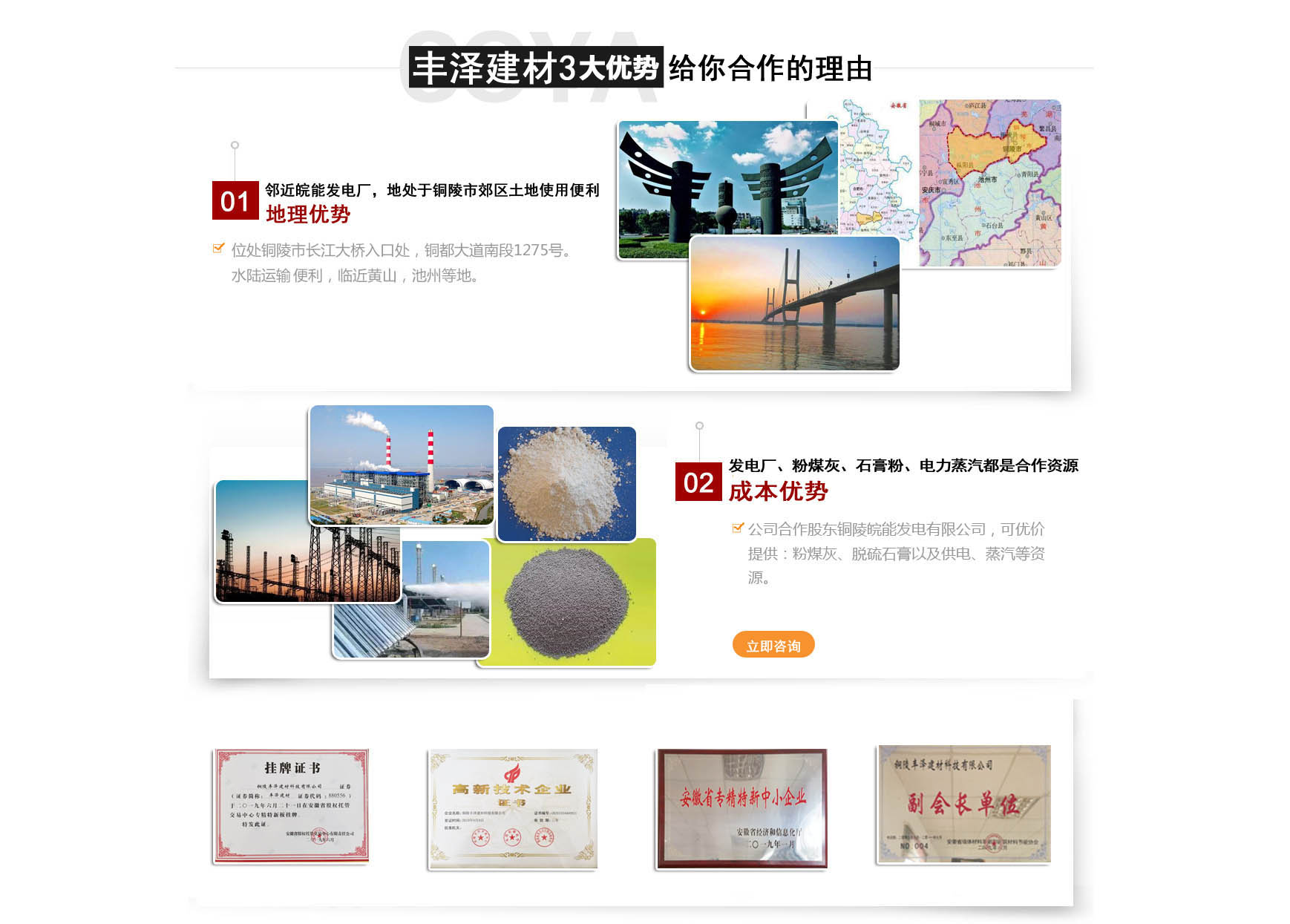 銅陵豐澤建材科技有限公司成立于2007年2月,坐落于銅都大道南段,占地4萬平方米,公司注冊資金1000萬元,現(xiàn)有職工百余人,是一家與皖能發(fā)電公司合作,專業(yè)從事電廠粉煤灰開發(fā)利用的高新科技企業(yè),現(xiàn)擁有一條年產(chǎn)30萬立方米蒸壓加氣混凝土全自動生產(chǎn)線。 蒸壓加氣混領(lǐng)土(英文名Autoclaved aerated comcrete),也稱AAC,是以砂、粉煤灰等硅質(zhì)材料和石灰、水泥等鈣質(zhì)材料為主要原料,摻加鋁粉為發(fā)氣劑,進(jìn)行生產(chǎn)的新型墻體材料。是我國推廣應(yīng)用最早,使用最廣泛,技術(shù)最完整的輕質(zhì)保溫墻體材料之一,自問世以來,始終方興未艾,備受推崇。